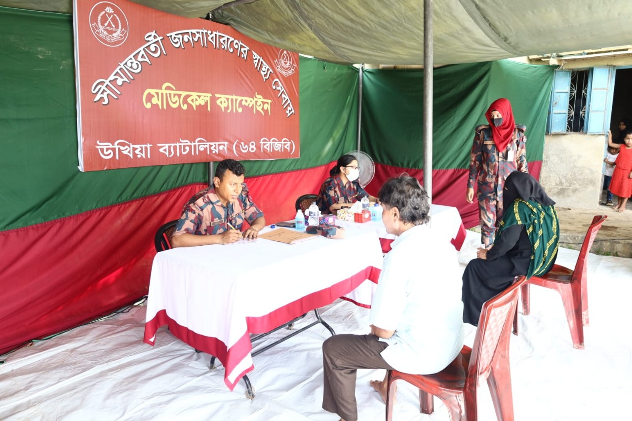 ২৩ জুলাই(বুধবার)সাড়ে ১১ টা হতে দুপুর পৌণে টা পর্যন্ত ৬৪ বিজিবি'র অধিনায়ক লেফটেন্যান্ট কর্নেল মোহাম্মদ জসীম উদ্দিন, পিএসসি'র সার্বিক দিক-নির্দেশনায় ঝিম মংখালী বিওপি’র দায়িত্বপূর্ণ এলাকায় বিওপি সংলগ্ন বাগানবাড়ী নামক স্থানে মেডিকেল অফিসার মেজর নওরীন নাজ আহমেদ, এএমসি এবং মেজর মোঃ শাহাদাত হোসেন শুভ, এএমসি কর্তৃক ২৪৩ জন (পুরুষ-৮৫ জন, মহিলা-১১৯ জন এবং শিশু-৩৯ জন) অসহায় ও গরীব দুস্থ মানুষকে চিকিৎসা সেবা ও বিনামূল্যে ঔষধ সামগ্রী সরবরাহ করা হয়। উক্ত মেডিকেল ক্যাম্পেইনে মেজর ইশতিয়াক আহমেদ, উপ অধিনায়ক, উখিয়া ব্যাটালিয়ন (৬৪ বিজিবি) ও সহকারী পরিচালক মোঃ মাসুদ রানা, ভারপ্রাপ্ত কোয়ার্টার মাষ্টার, উখিয়া ব্যাটালিয়ন (৬৪ বিজিবি) উপস্থিত ছিলেন।বর্ডার গার্ড বাংলাদেশ, কক্সবাজার রিজিয়নের রামু সেক্টরের অধীনস্থ উখিয়া ব্যাটালিয়ন (৬৪ বিজিবি) সদা জাগ্রত অতন্দ্র প্রহরী। সীমান্ত নিরাপত্তায় দেশের সর্ব দক্ষিণের বাংলাদেশ-মায়ানমার সীমান্তে দায়িত্ব পালন করছে। উখিয়া ব্যাটালিয়ন সীমান্ত সুরক্ষা ছাড়াও চোরাচালান, মাদকদ্রব্য, অবৈধ অনুপ্রবেশ এবং আন্তঃ রাষ্ট্রীয় সীমান্ত অপরাধ দমনে যথাযথ ও কার্যকরীভাবে পেশাদারিত্বের সাথে দায়িত্ব পালন করে বেসামরিক পরিমন্ডলে ভূয়সী প্রশংসা অর্জন করেছে। বিজিবি’র এই মানবিক উদ্যোগ ভবিষ্যতেও অব্যাহত থাকবে বলে জানানো হয়।