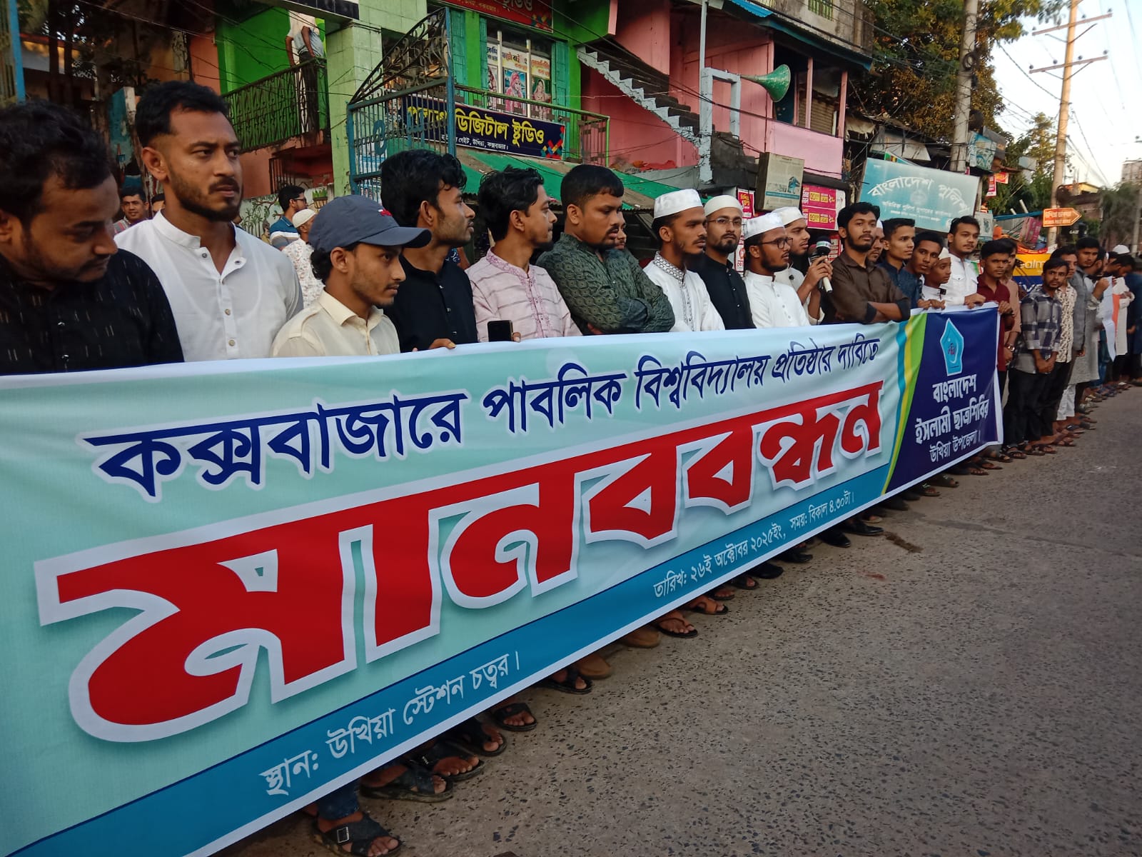 কক্সবাজারে পাবলিক বিশ্ববিদ্যালয় প্রতিষ্ঠার দাবিতে মানববন্ধন করেছে বাংলাদেশ ইসলামী ছাত্রশিবির,উখিয়া উপজেলা শাখা। রবিবার (২৬ অক্টোবর) ২০২৫ বিকেল সাড়ে ৪ টায় উখিয়া সরকারি উচ্চ বিদ্যালয়ের প্রধান ফটকের সামনে এ মানববন্ধন অনুষ্ঠিত হয়।